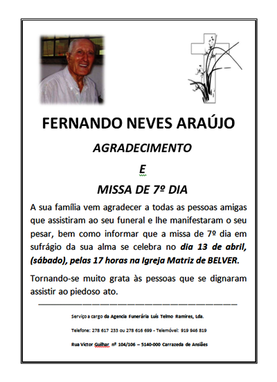 Faleceu hoje dia 7 de abril, no Hospital de Mirandela, com 89 anos de idade o Senhor Fernando Neves Araújo, Mas conhecido entre os amigos como “Fernando Barbeiro”.